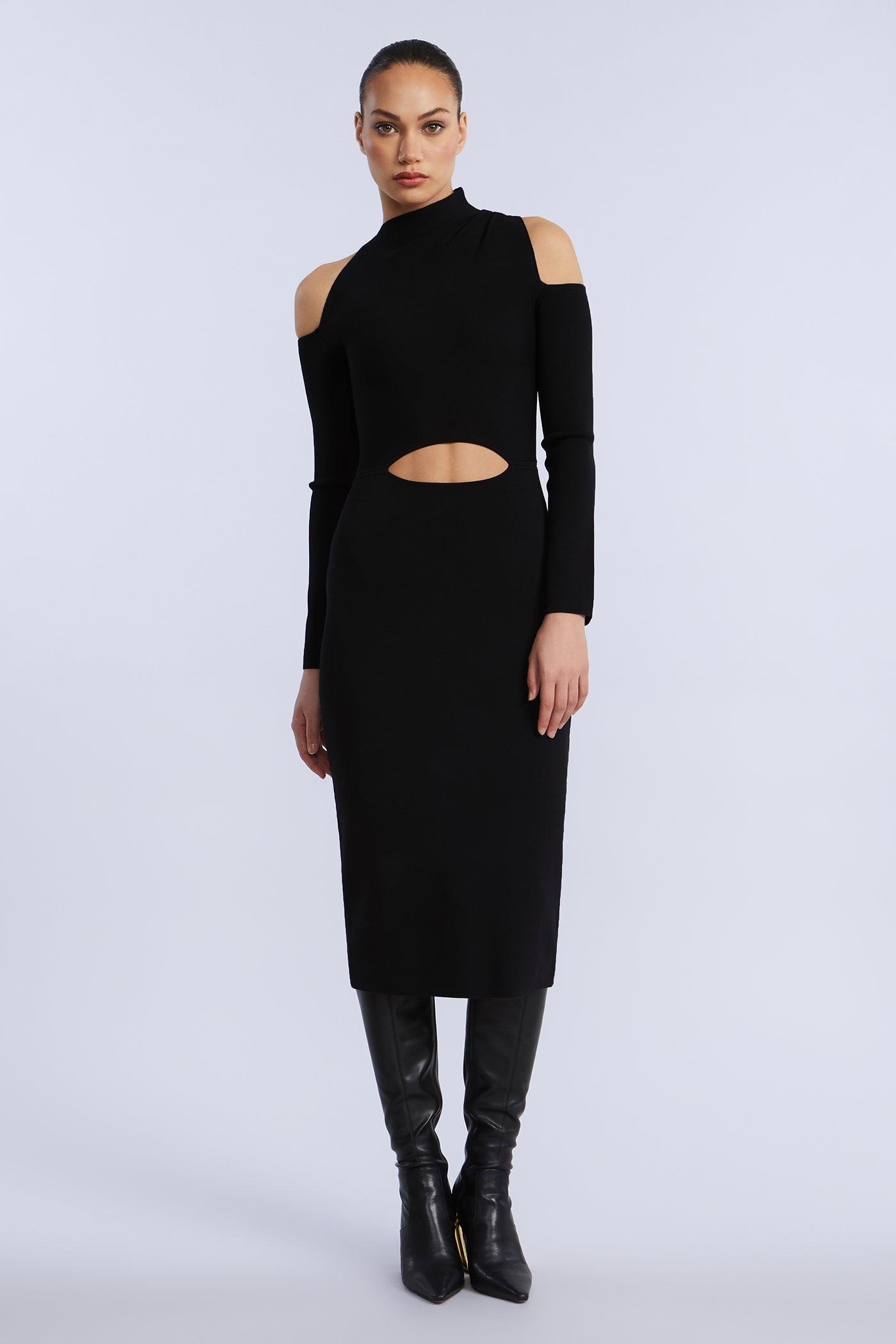 Sleek midi dress in structured knit jersey with sharp cutout detailing at the waist. Framed by cold shoulder sleeves and a modern high neckline. Finished with a concealed back zipper for a clean, body-hugging fit.