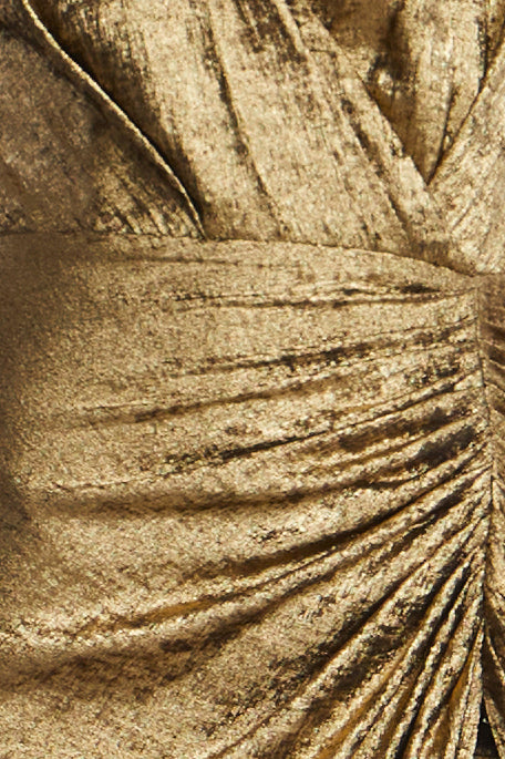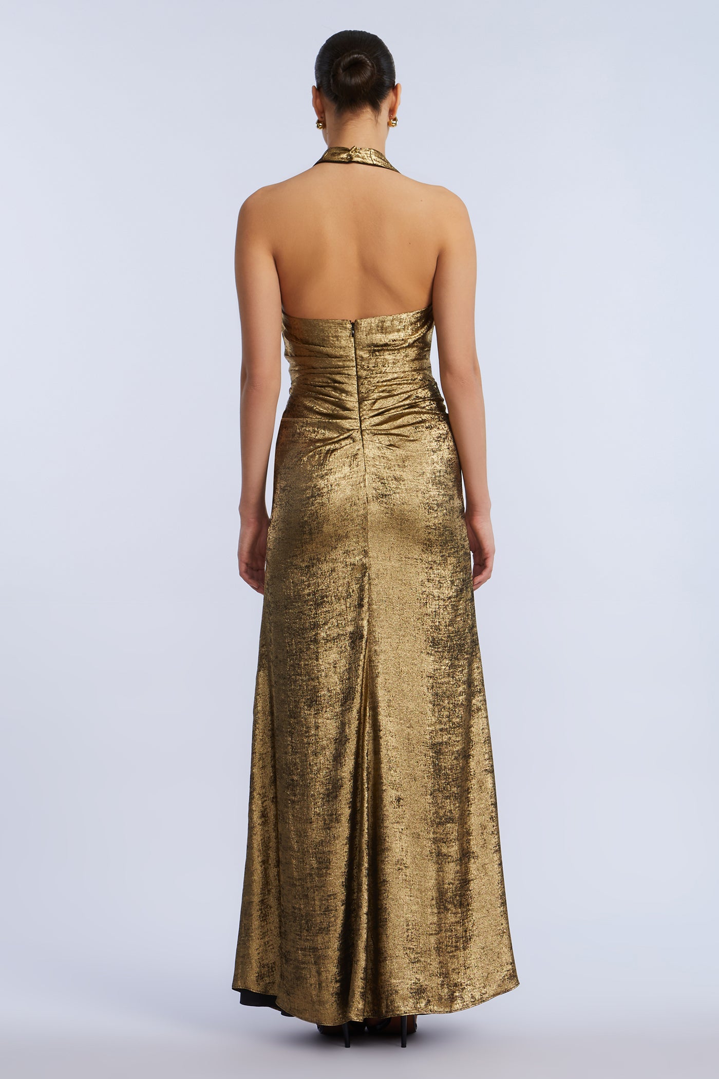 Metallic textured jersey gown with a deep draped neckline and ruched wrap-effect waist. Designed with a high slit and halter straps that cross at the back. Complete with a concealed zipper—perfect for holiday galas and red carpet nights.