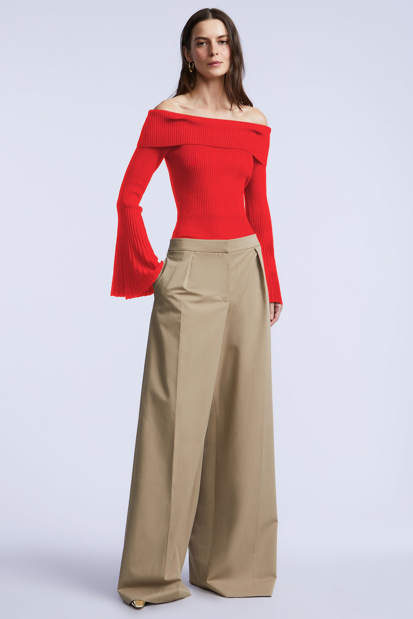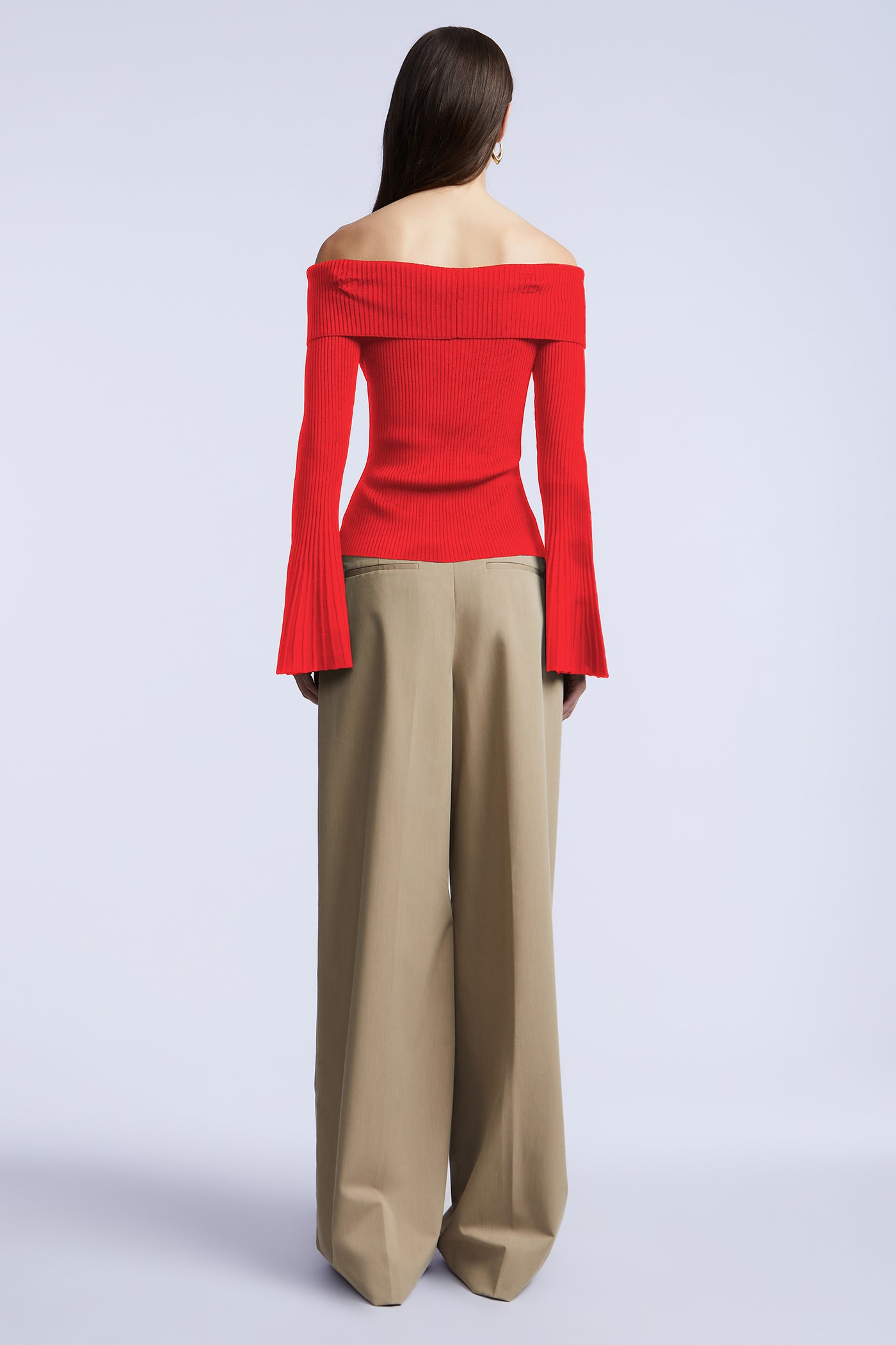 Off-the-shoulder ribbed knit top with a foldover neckline and flared sleeves. Designed in a sculpted stretch knit that smooths and flatters the frame. A sleek essential that transitions effortlessly from work dinners to winter nights out.