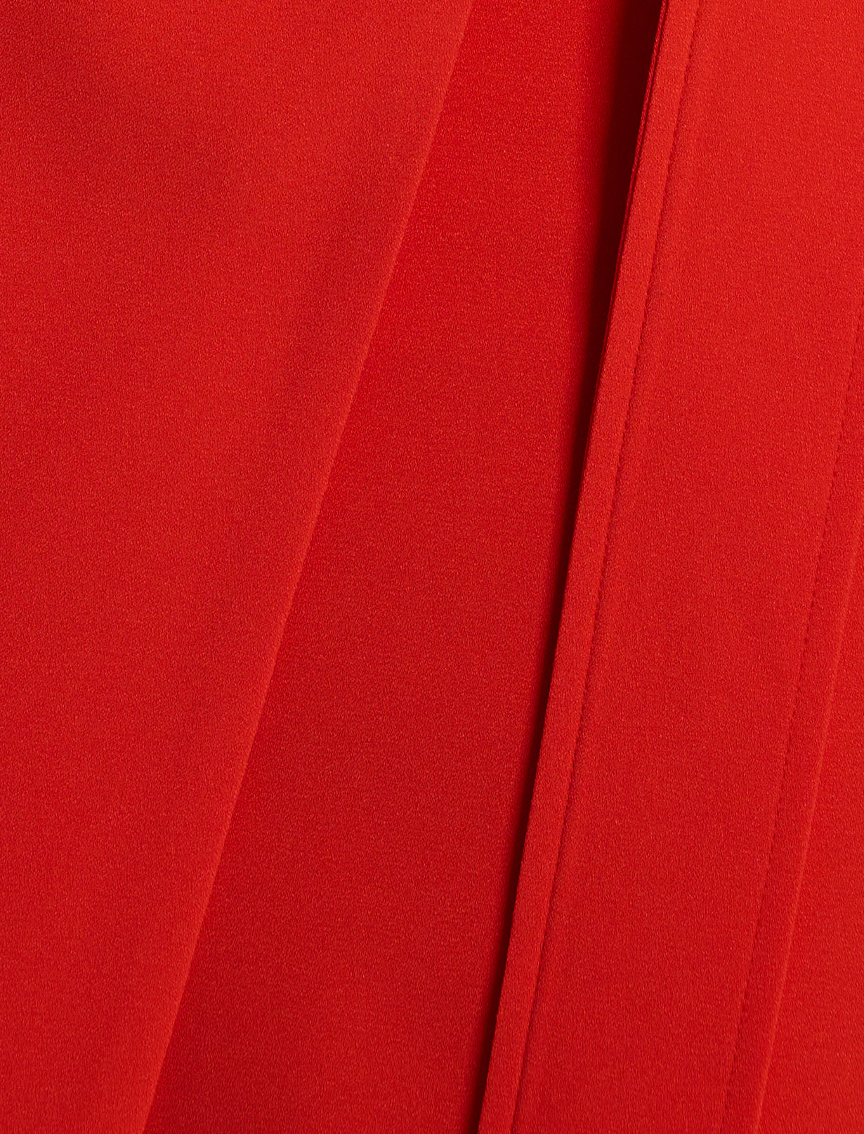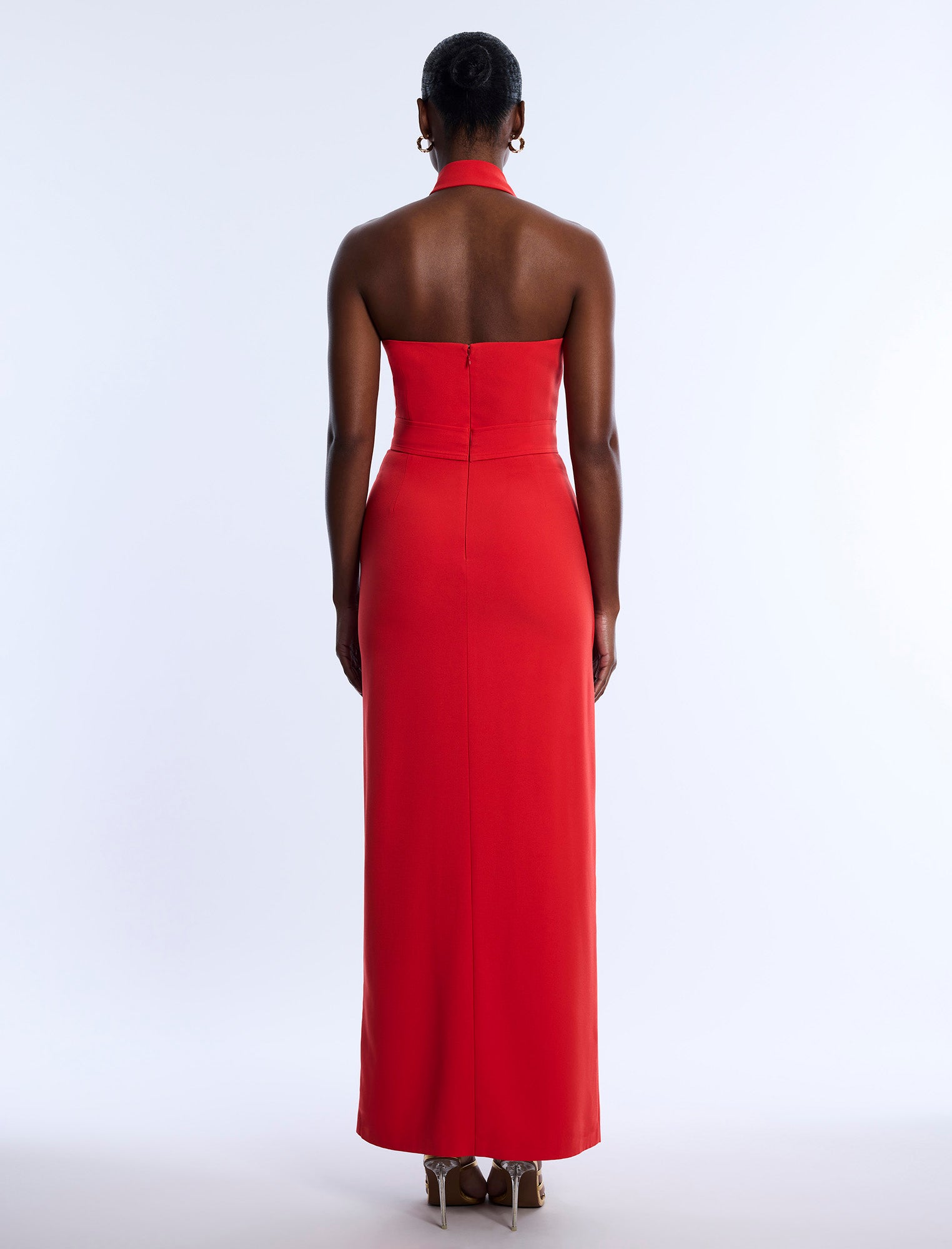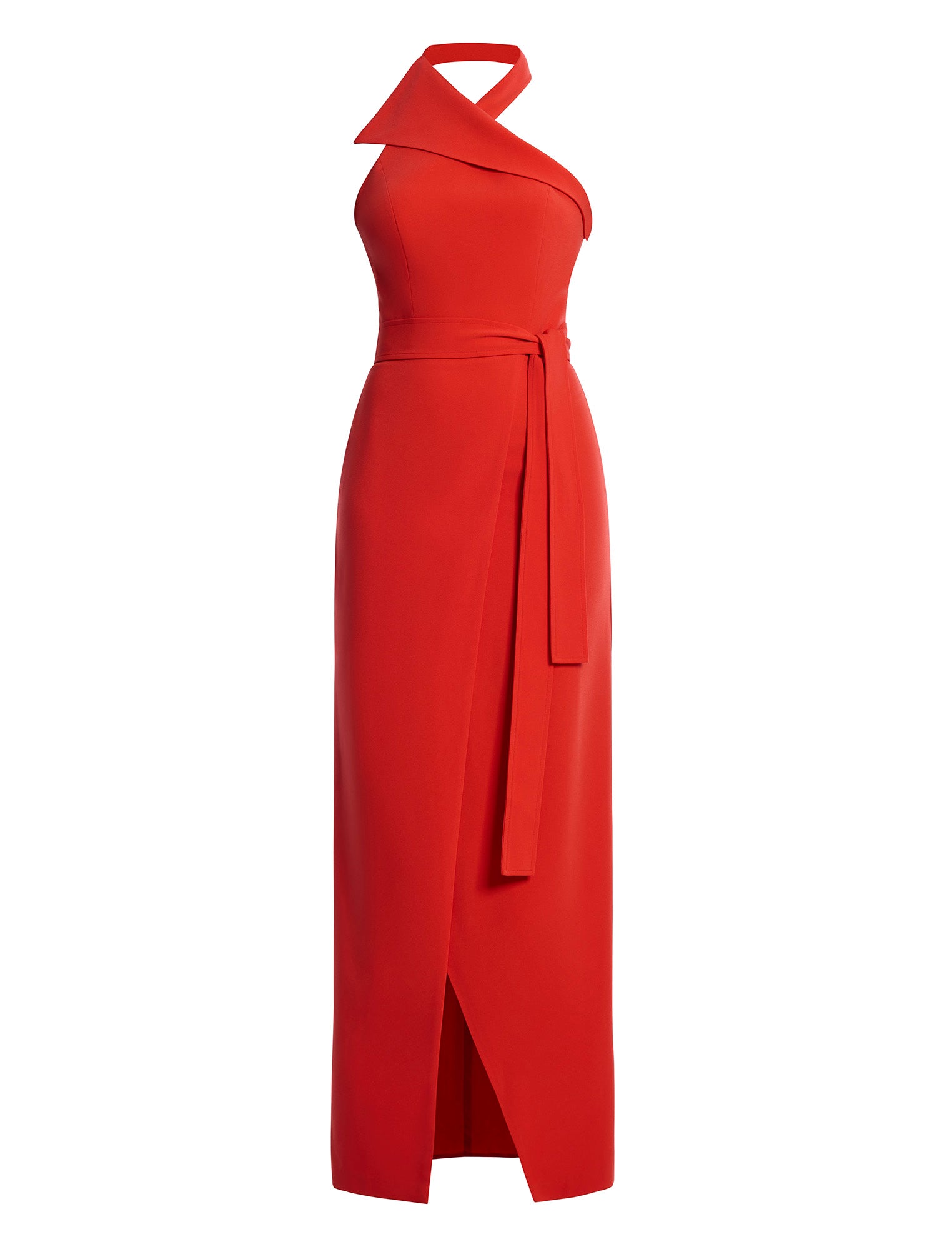 Halter column gown in bold red, featuring a sculptural crossover neckline, waist-defining sash, and a wrap-style skirt with a subtle slit. Clean lines and sharp angles bring the drama—perfect for weddings, galas, or anywhere you plan to be unforgettable.