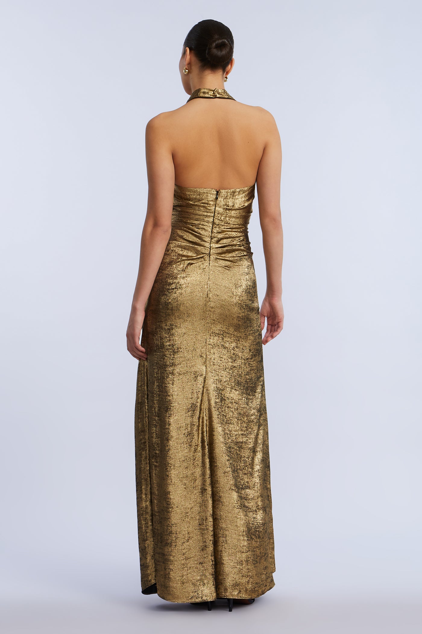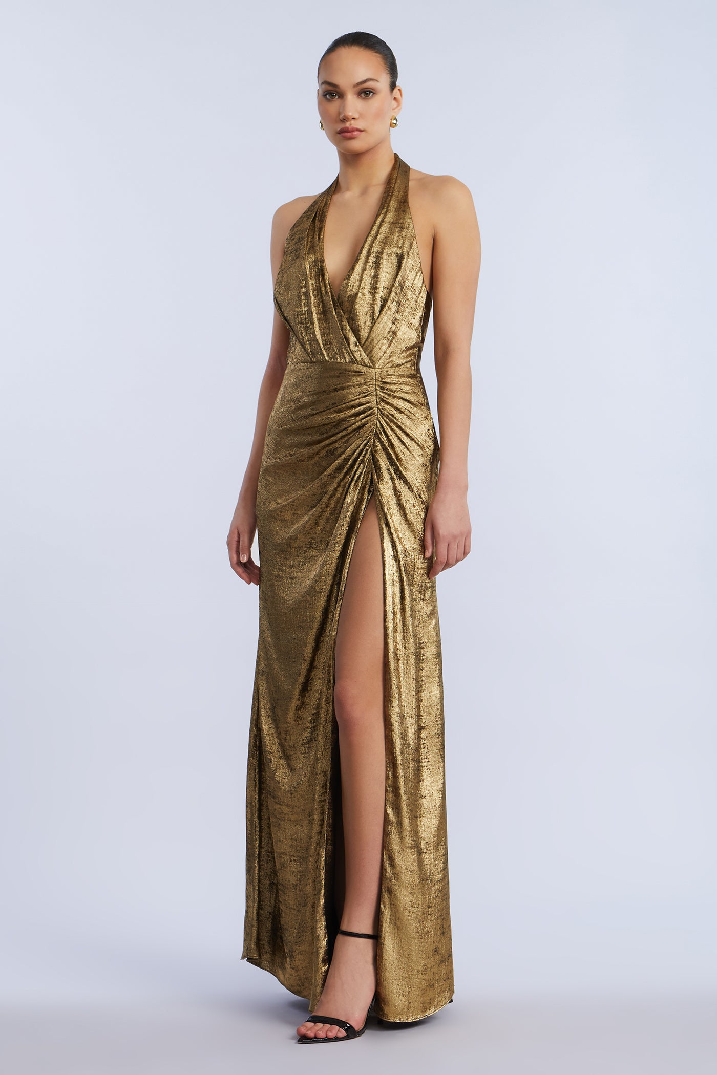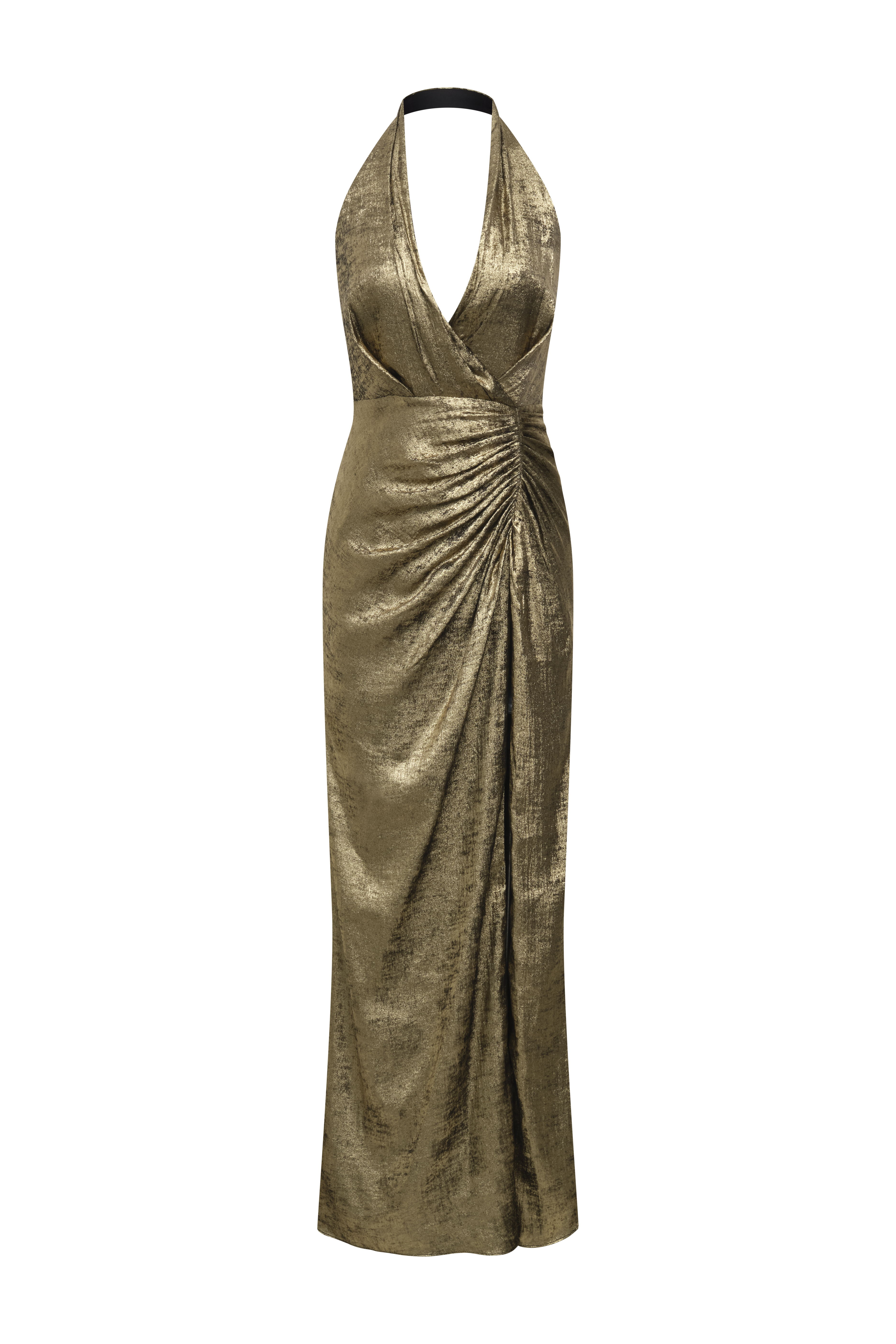 Metallic textured jersey gown with a deep draped neckline and ruched wrap-effect waist. Designed with a high slit and halter straps that cross at the back. Complete with a concealed zipper—perfect for holiday galas and red carpet nights.