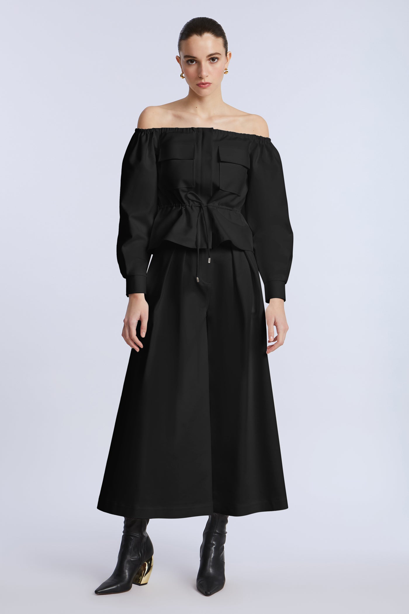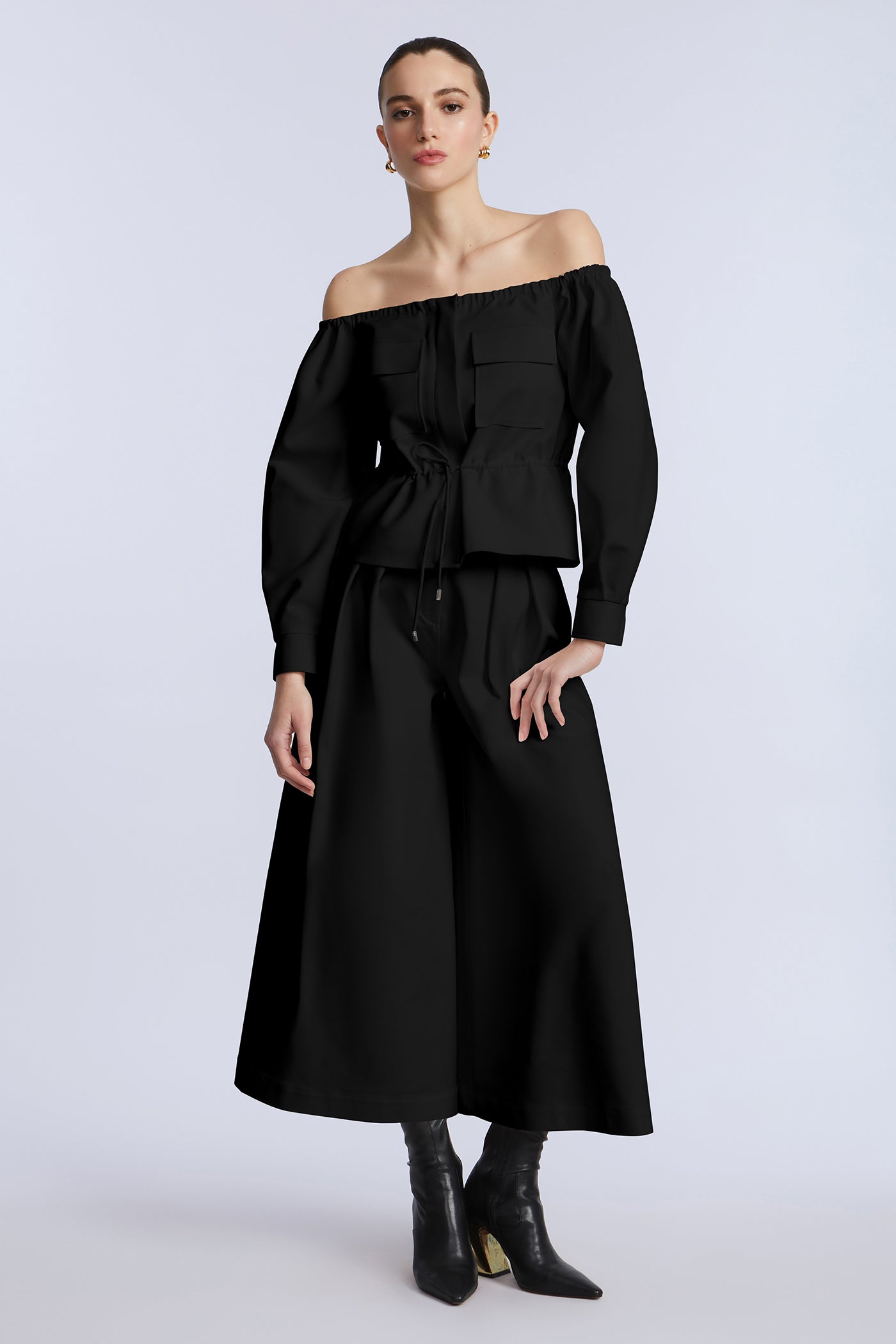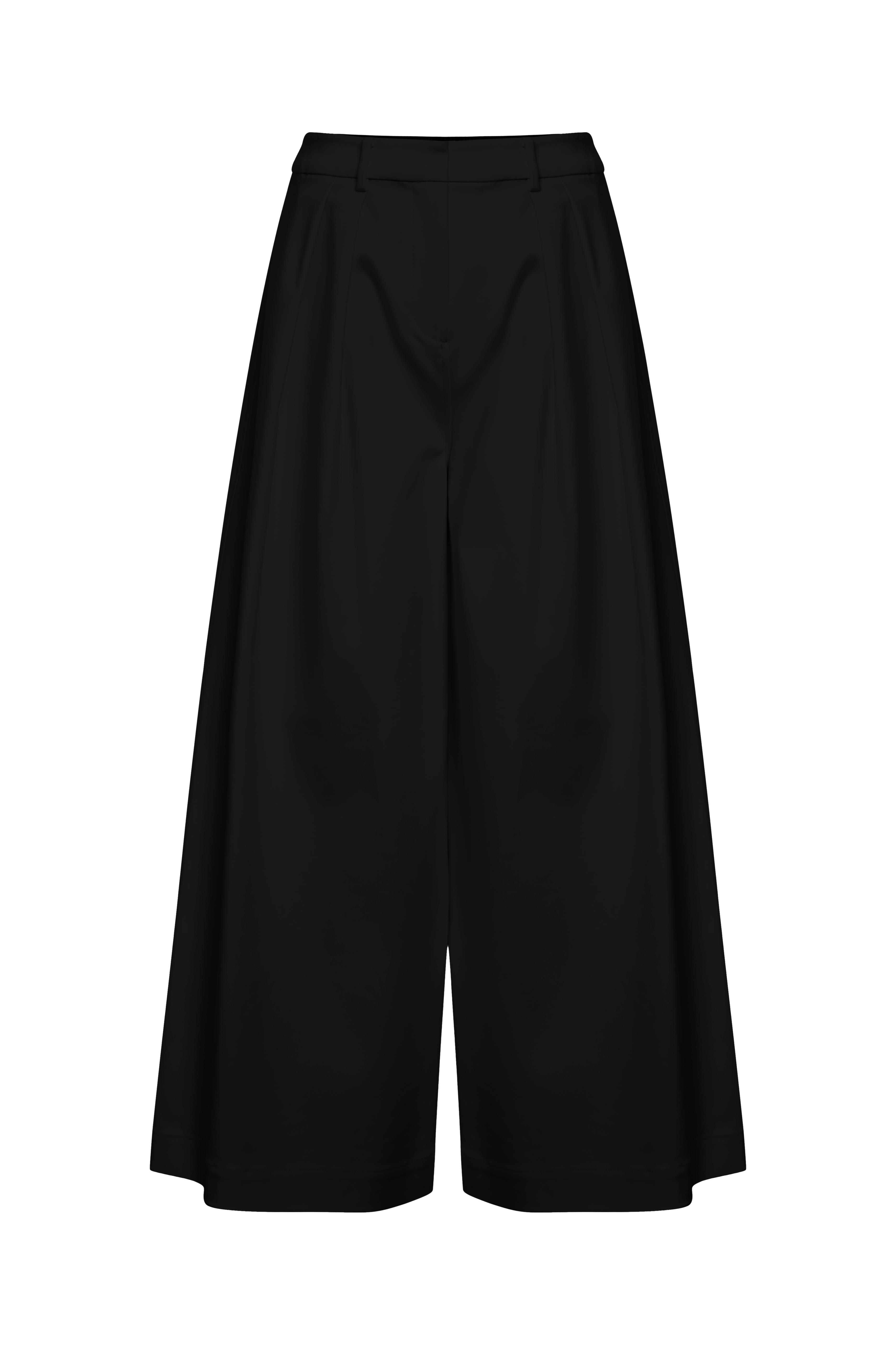 Wide-leg cropped pants in classic black cotton sateen. Designed with pleated front detailing and a clean waistband for a sculpted finish. Add the matching top for a sleek monochrome moment.