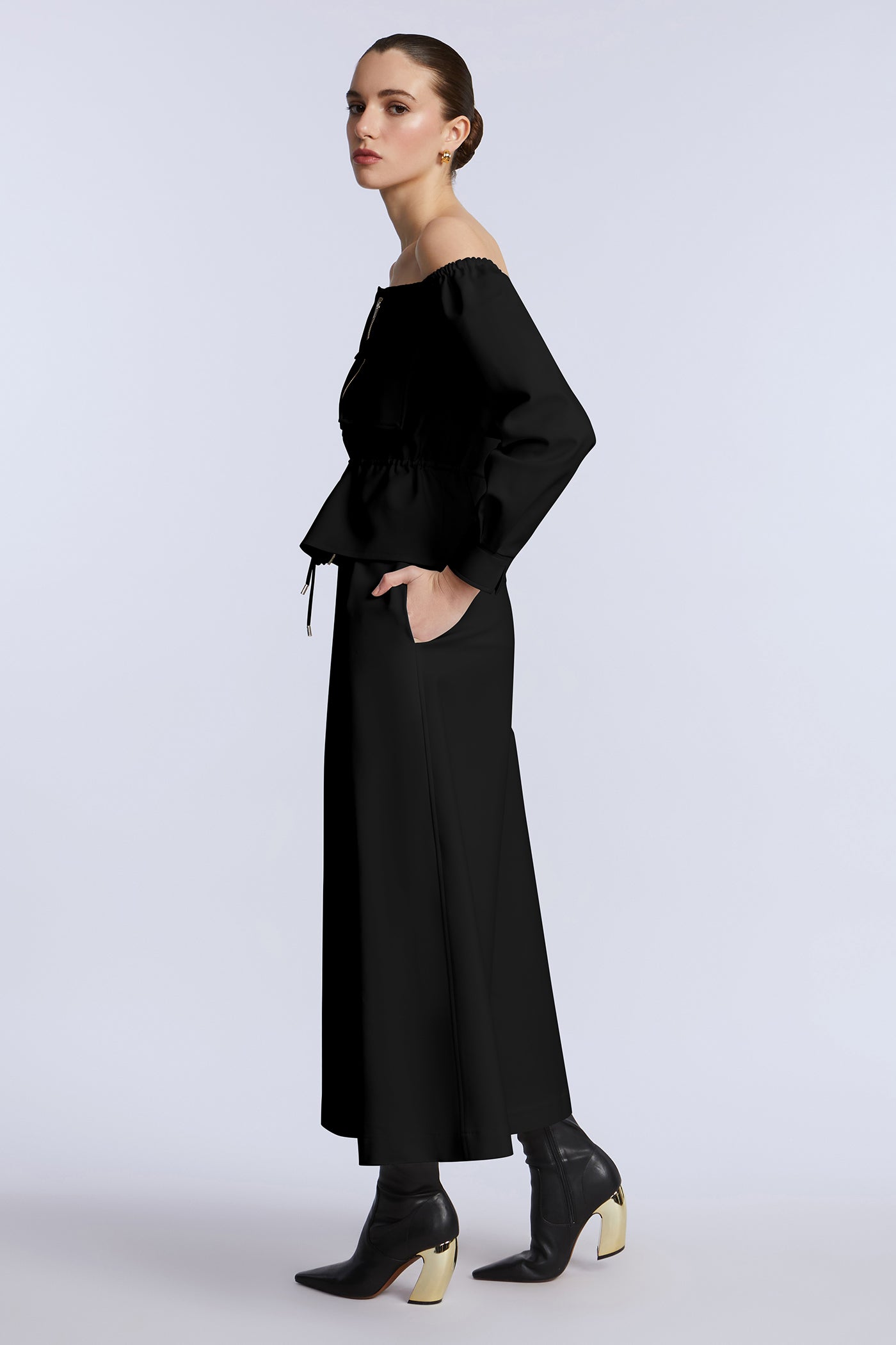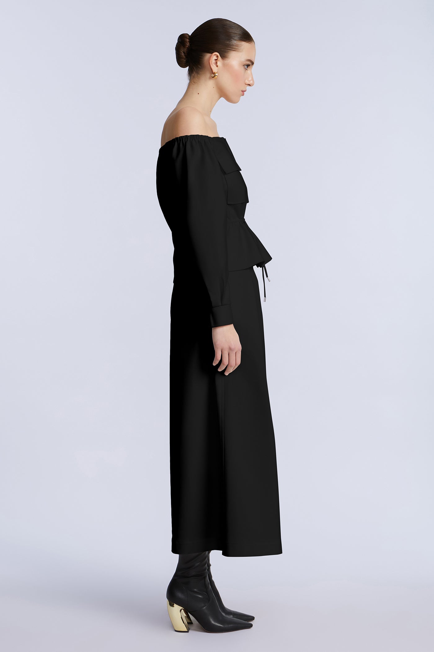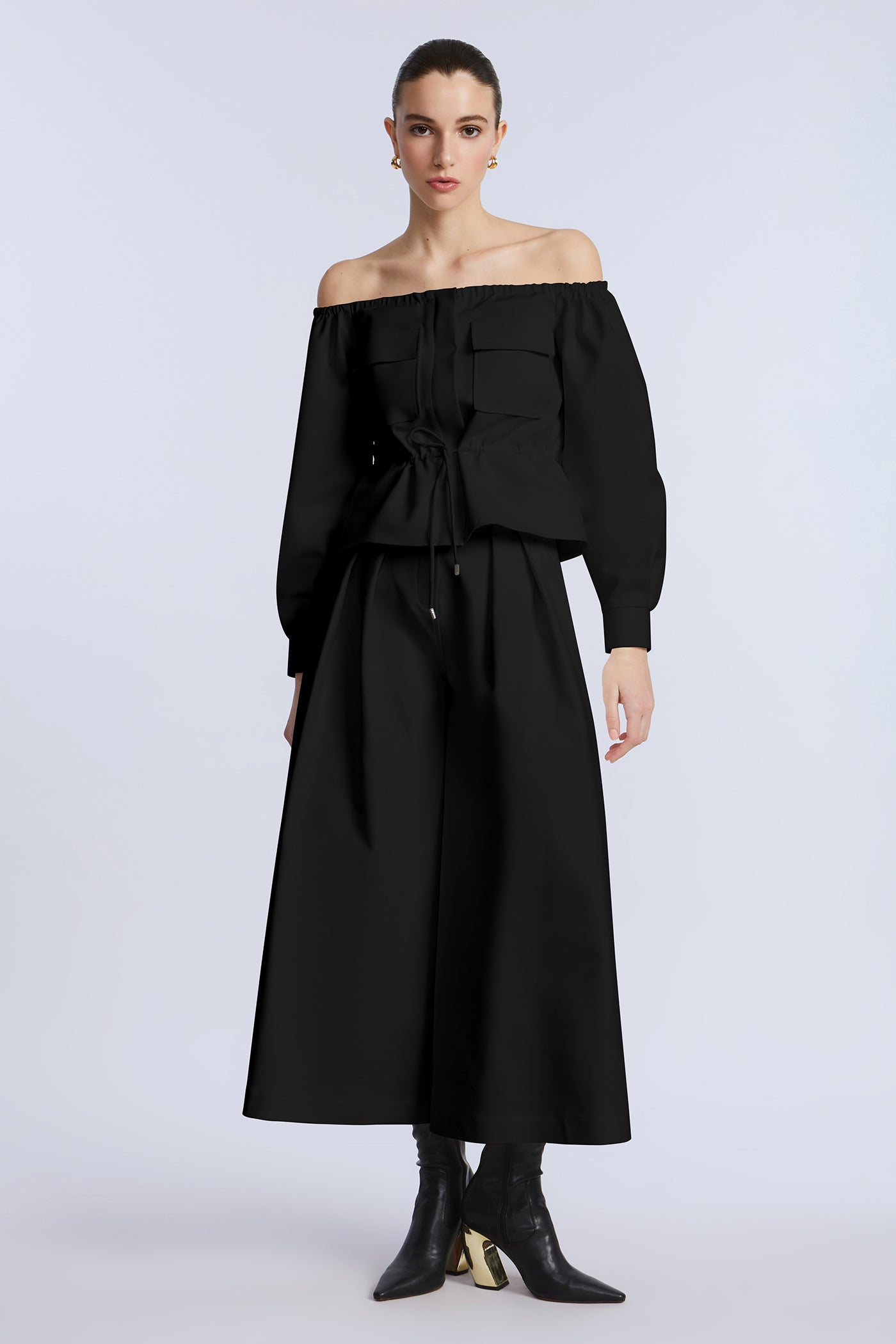 Wide-leg cropped pants in classic black cotton sateen. Designed with pleated front detailing and a clean waistband for a sculpted finish. Add the matching top for a sleek monochrome moment.