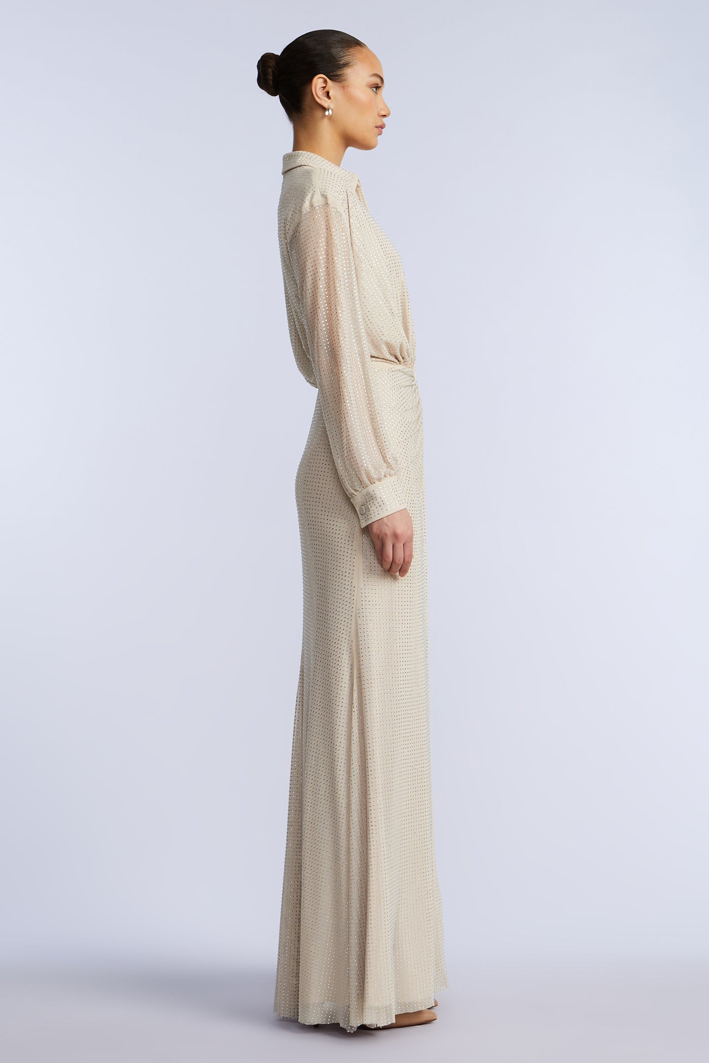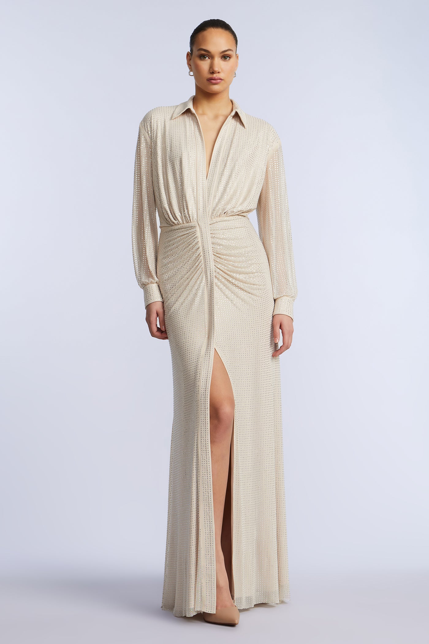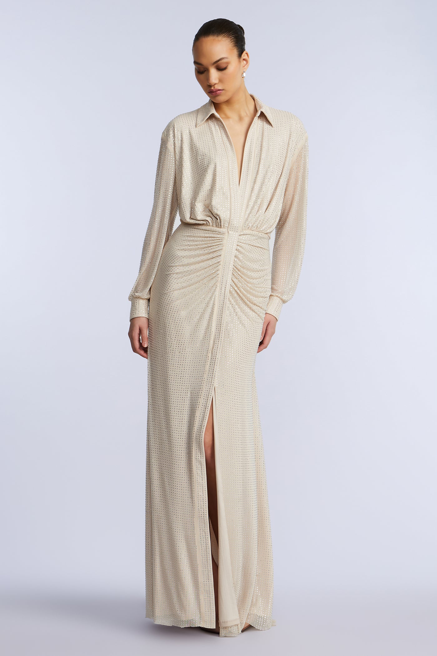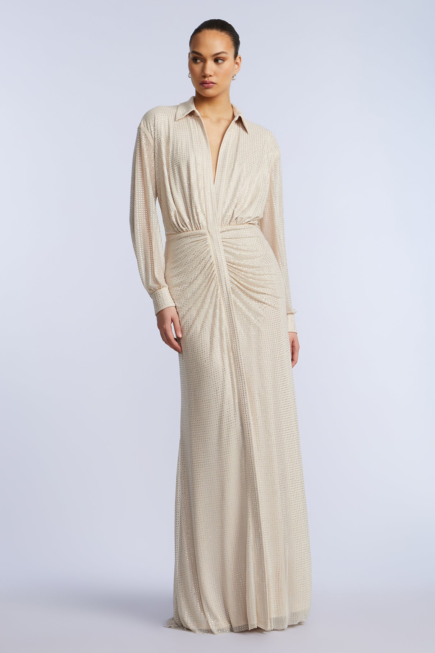 Metallic mesh gown with micro rhinestone embellishment and soft gathered pleating at the waist. Draped front and blouson bodice create effortless shape with subtle sparkle. Sleek enough for galas, relaxed enough for rooftop celebrations.