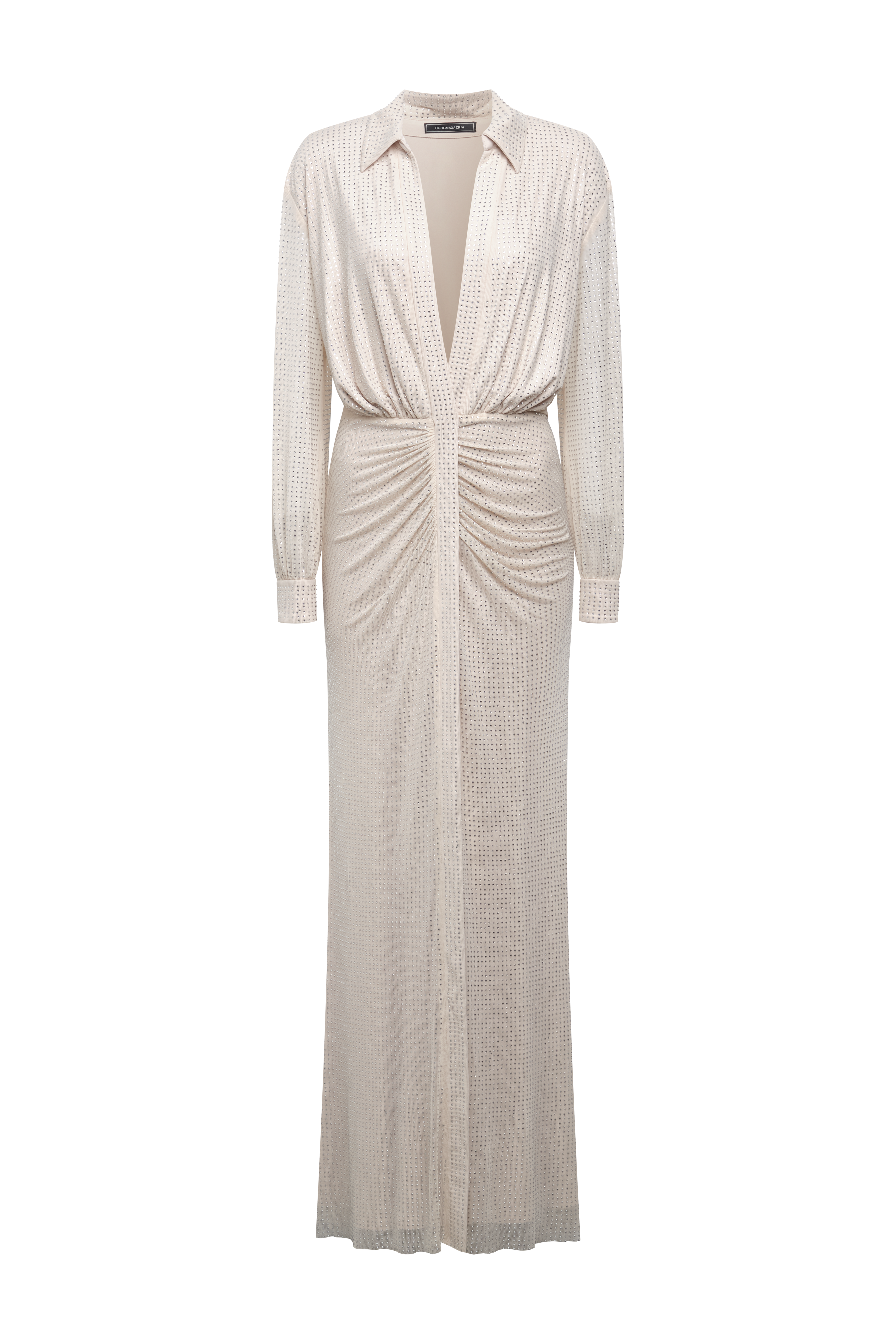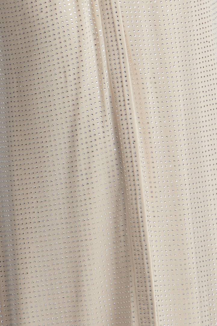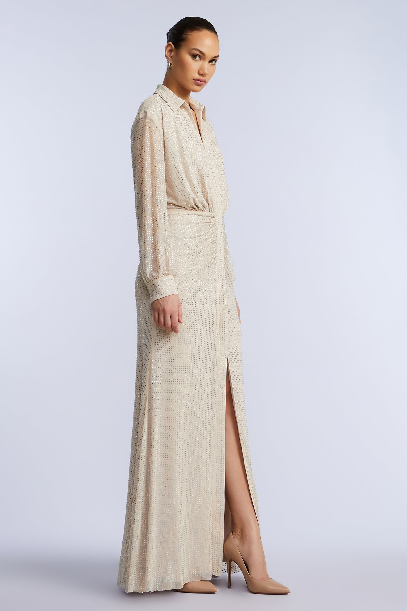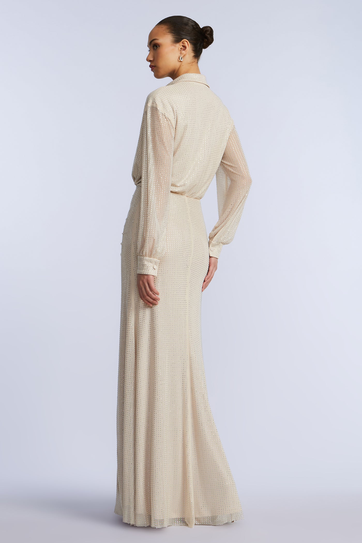 Metallic mesh gown with micro rhinestone embellishment and soft gathered pleating at the waist. Draped front and blouson bodice create effortless shape with subtle sparkle. Sleek enough for galas, relaxed enough for rooftop celebrations.