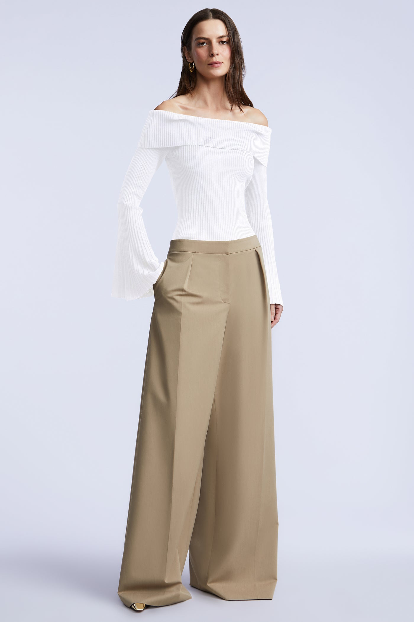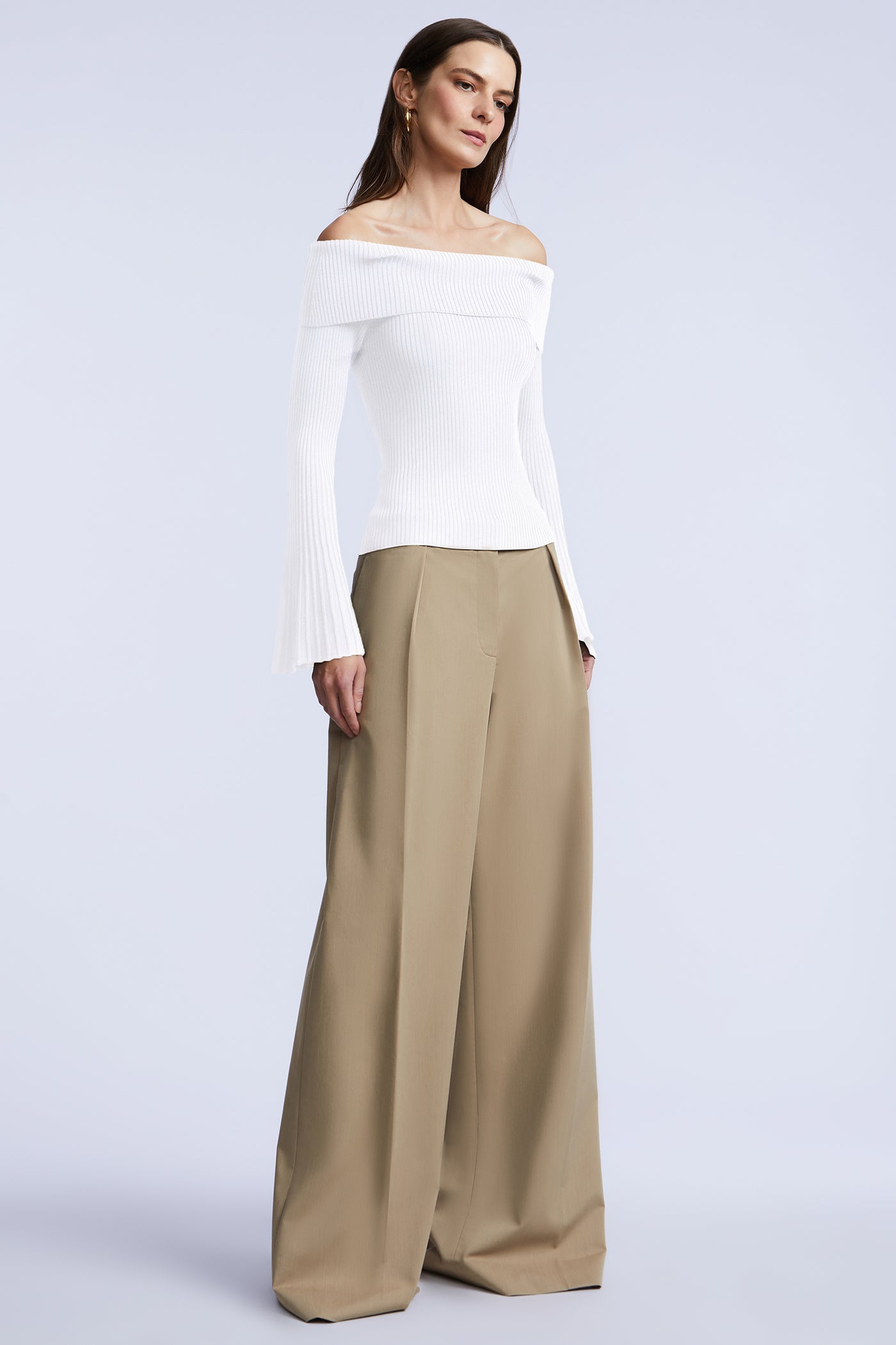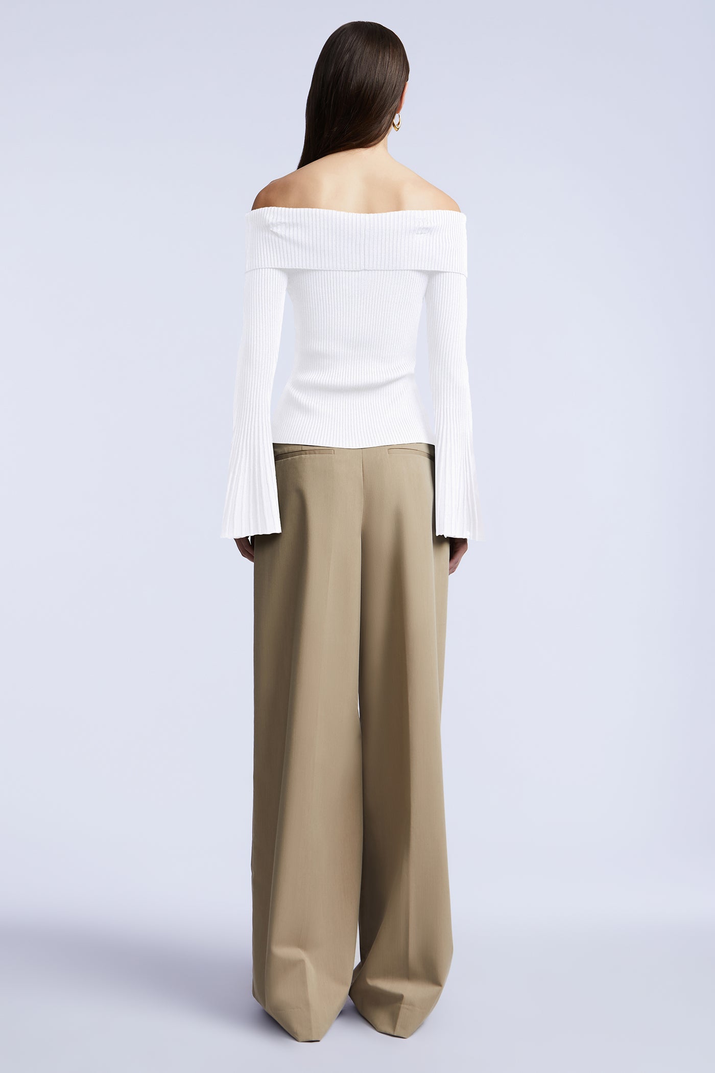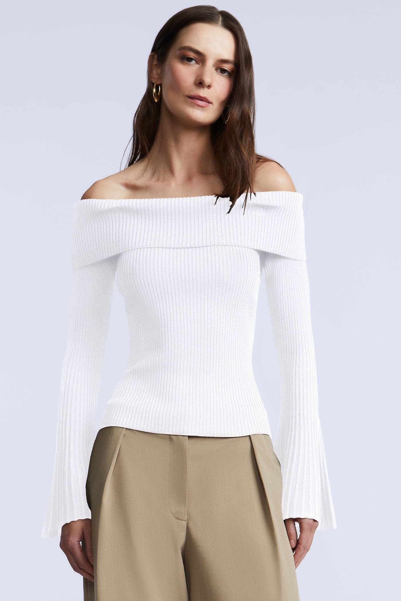 Off-the-shoulder ribbed knit top with a foldover neckline and flared sleeves. Designed in a sculpted stretch knit that smooths and flatters the frame. A sleek essential that transitions effortlessly from work dinners to winter nights out.